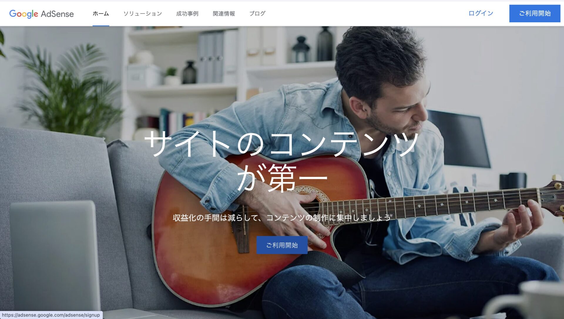 まずは「Googleアドセンスの公式サイト」にアクセスし、表示されたら「ご利用開始」をクリックしましょう。